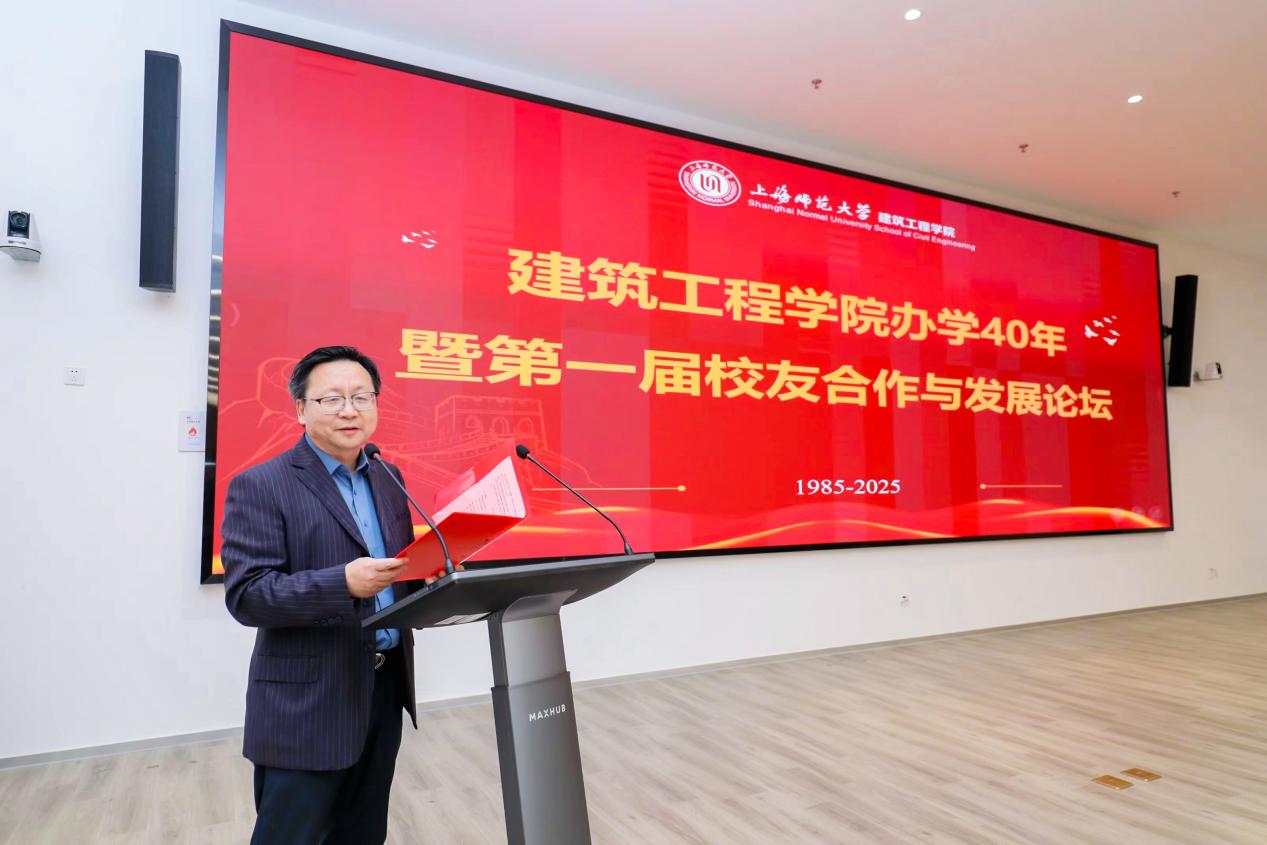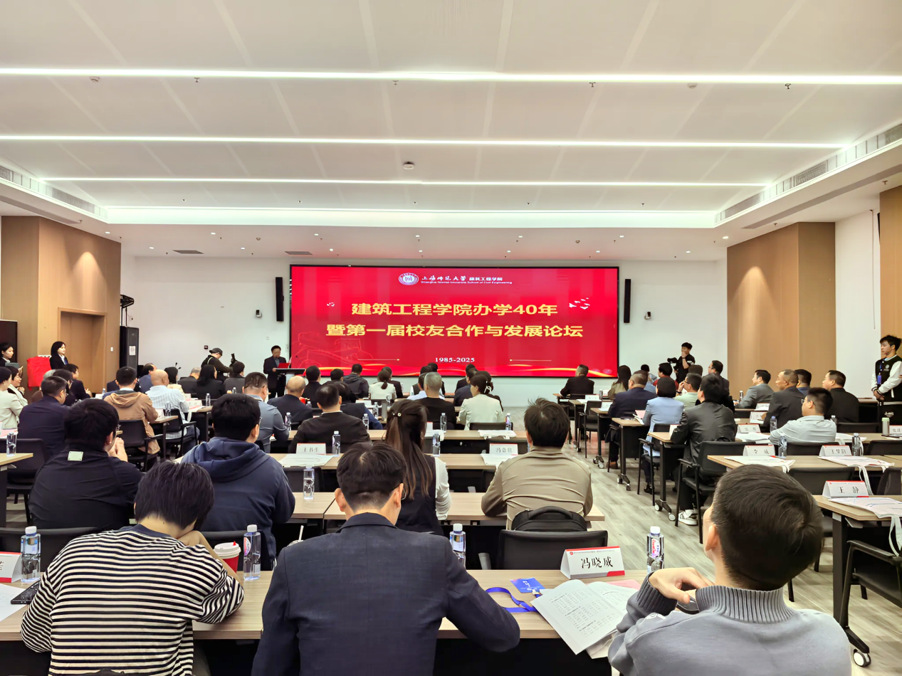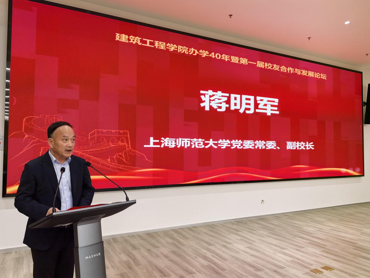 10月25日下午,建筑工程学院办学40年暨第一届校友合作与发展论坛在奉贤校区大学生综合发展与现代服务中心举办。上海师范大学党委常委、副校长蒋明军,奉贤校区管委会副主任施家仓;建筑工程学院原党总支书记张惠康、樊连生、徐丰、沈亚芳,原院长张宇鑫,原副院长王小彭、王增忠、蔡泖华;学校办公室副主任张向红、郭勤一;最佳雇主单位代表、上海建工七建集团人力资源部总经理朱剑君;老教师代表,校友代表;建筑工程学院领导班子成员,师生代表参加。大家欢聚一堂,回首四秩芳华,共绘壮阔蓝图。