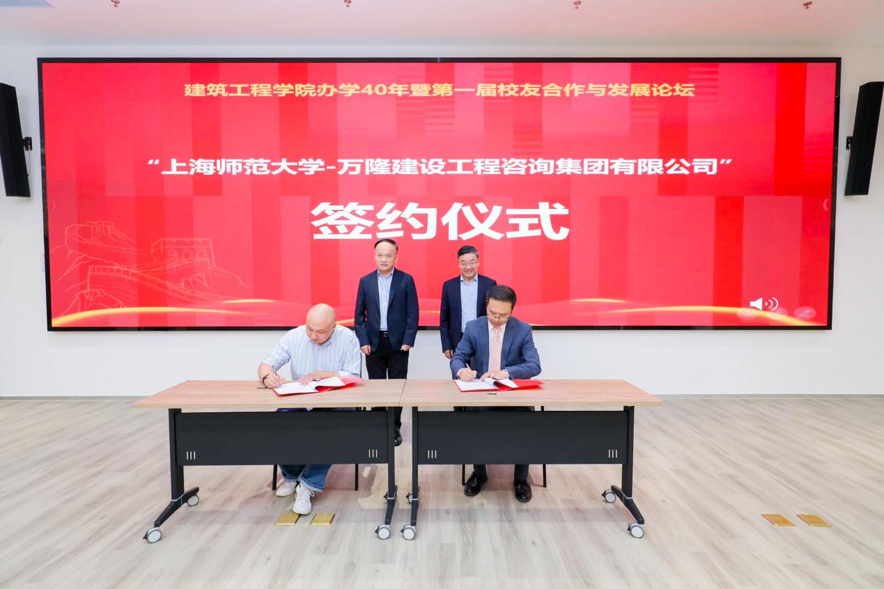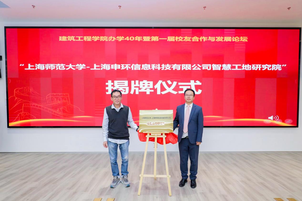会上还举办了“上海师范大学——万隆建设工程咨询集团有限公司”签约仪式,胡振和贾栋代表双方签约。在随后举行的“上海师范大学-上海申环信息科技有限公司智慧工地研究院”揭牌仪式上,胡振和毛鸣军共同揭牌。