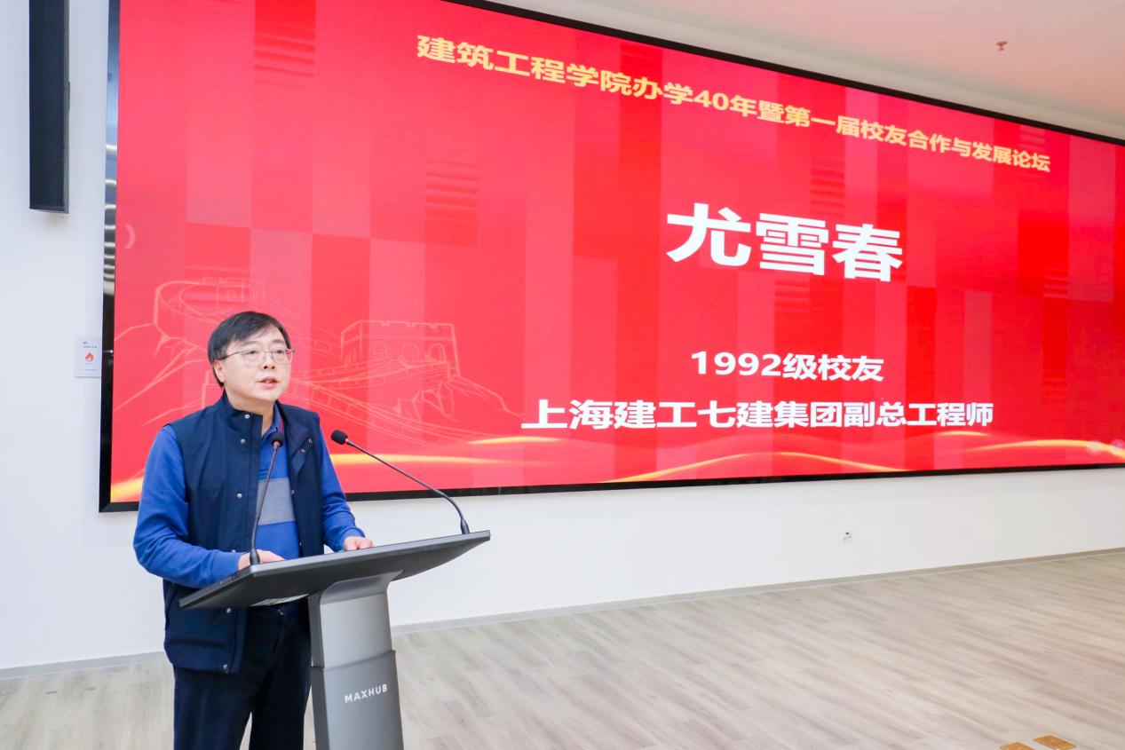 校友代表发言环节,1992级校友、上海建工七建集团副总工程师尤雪春在发言中回顾了其参与多项国家重大工程的经历,指出建筑业正面临向智能化、数字化转型的关键时期。他建议学院加强智能建造人才培养,并希望校企能通过共建产业学院、推行校企双导师制、共建实训基地、引入真实项目案例等方式深化合作,帮助学生掌握前沿技术。2005级校友、上海市五一劳动奖章获得者、上海隧道工程公司副总经理冯师聚焦于未来校企合作的广阔空间,提出可在国际工程实践、智慧城市运营及长三角一体化建设中深化产学研融合。他期待校友资源、企业需求与学院智慧更紧密地结合,实现传承、创新、共赢的良好局面,让建工精神在新时代的新工科之路上持续闪耀。