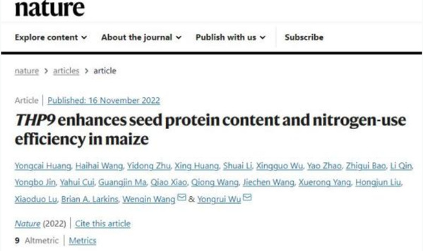 11月17日,上海师范大学王文琴研究团队与中国科学院分子植物科学卓越创新中心巫永睿研究团队合作在Nature上发表了题为 “THP9 enhances seed protein content and nitrogen-use efficiency in maize”的研究论文。科研人员从野生玉米中克隆了控制玉米高蛋白品质形成和氮素高效利用的关键变异基因Teosinte High Protein 9 (THP9),成功让整株玉米的蛋白质含量接近翻倍。玉米籽实中的蛋白质含量从8%平均提升至14%,未来有望提高到20%。
