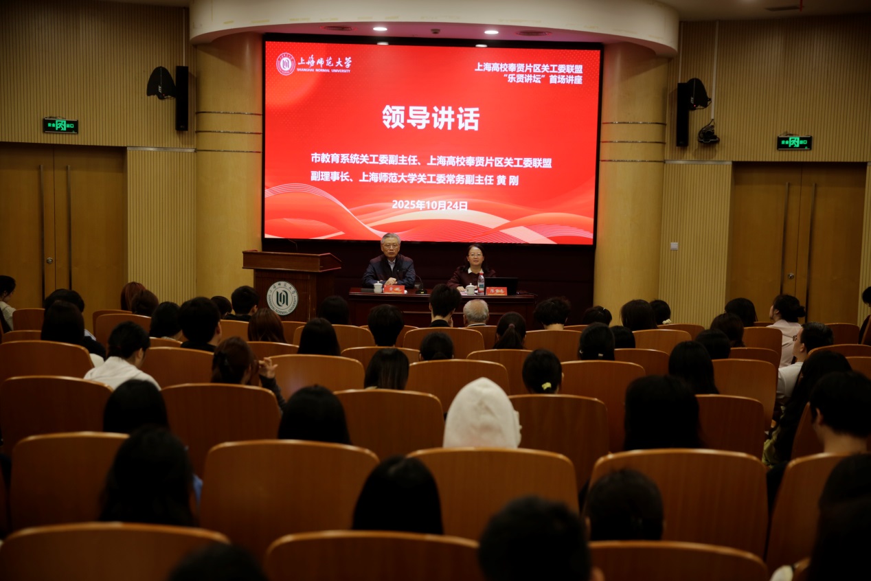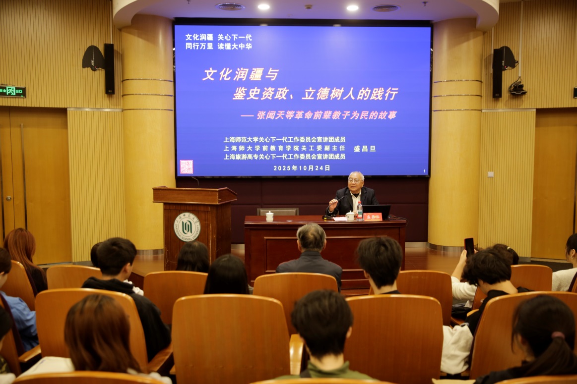 10月25日下午,上海高校奉贤片区关工委联盟“乐贤讲坛”首场讲座在上海师大奉贤校区图文信息中心二楼报告厅举行。来自上海师范大学、华东理工大学、上海应用技术大学、上海商学院、上海旅游高等专科学校、上海城建职业学院的教师与学生代表齐聚于此,共同聆听上海师范大学关工委讲师团成员、特邀党建组织员、学前教育学院关工分会副主任盛昌旦老师所作的讲座——《文化润疆与鉴史资政、立德树人的实践——张闻天等革命前辈教子为民的故事》。市教育系统关工委副主任、上海高校奉贤片区关工委联盟副理事长、上海师范大学关工委常务副主任黄刚出席活动。讲座由联盟秘书长、上海师范大学关工委秘书长、离退休工作部副部长陈重来主持。