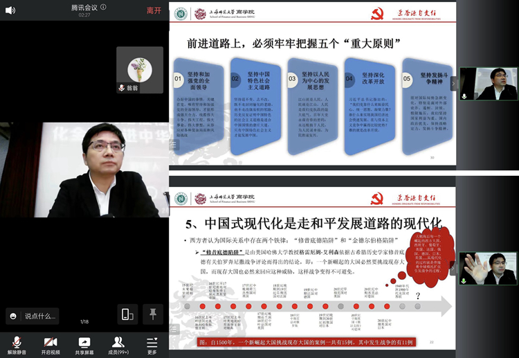 为进一步引导广大教职工全面准确学习领会党的二十大精神,将思想行动统一到党的二十大精神上来,12月8日下午,哲法学院邀请校党的二十大精神专家理论宣讲团成员、商学院党委副书记、院长刘江会教授为全院师生线上开展《举旗定向踏征程,以中国式现代化全面推进中华中华民族伟大复兴》党的二十大报告解读专题报告。