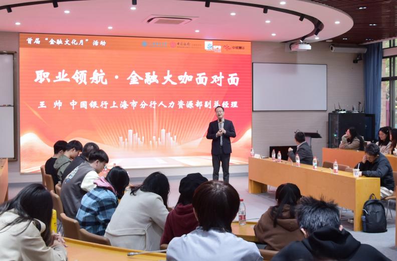 开幕式后举行了“职业领航·金融大咖面对面”讲座。中国银行上海市分行党委组织部副部长、人力资源部副总经理王帅以“洞悉就业新形势,规划职业新未来”为主题,深入剖析了人工智能在银行招聘中的应用场景、测评逻辑与实战策略。他通过生动的案例解析与技巧分享,助力学生把握数字化招聘新趋势,有效提升就业竞争力。讲座现场气氛热烈,互动踊跃,为同学们提供了前沿、实用的职业发展指引。