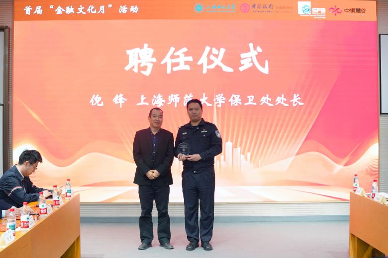 校保卫处处长倪锋为沪西高校派出所副所长宣伯杰颁发“上海师范大学金融反诈教育校外辅导员”聘书,携手筑牢校园金融反诈防护网。