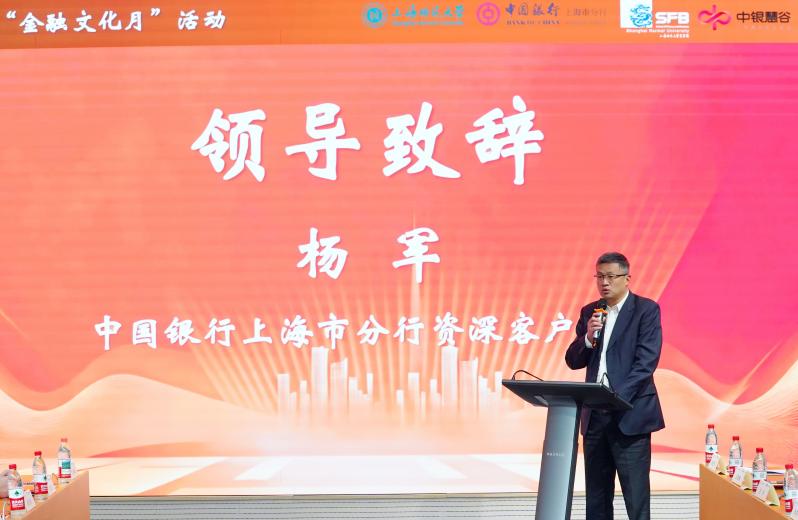杨军代表中国银行上海市分行对本次活动的顺利推进表示祝贺。他指出,上海师大始终以社会需求为导向,培育了大批知行合一的应用型人才。中国银行作为百年金融机构深耕上海国际金融中心建设,双方自2018年起深度合作,落地多个项目。此次金融文化月活动是双方深化产教融合的创新实践。中国银行将持续发挥资源优势,搭建从校园到职场的桥梁,助力学生成长为适应金融强国战略的高素质人才。