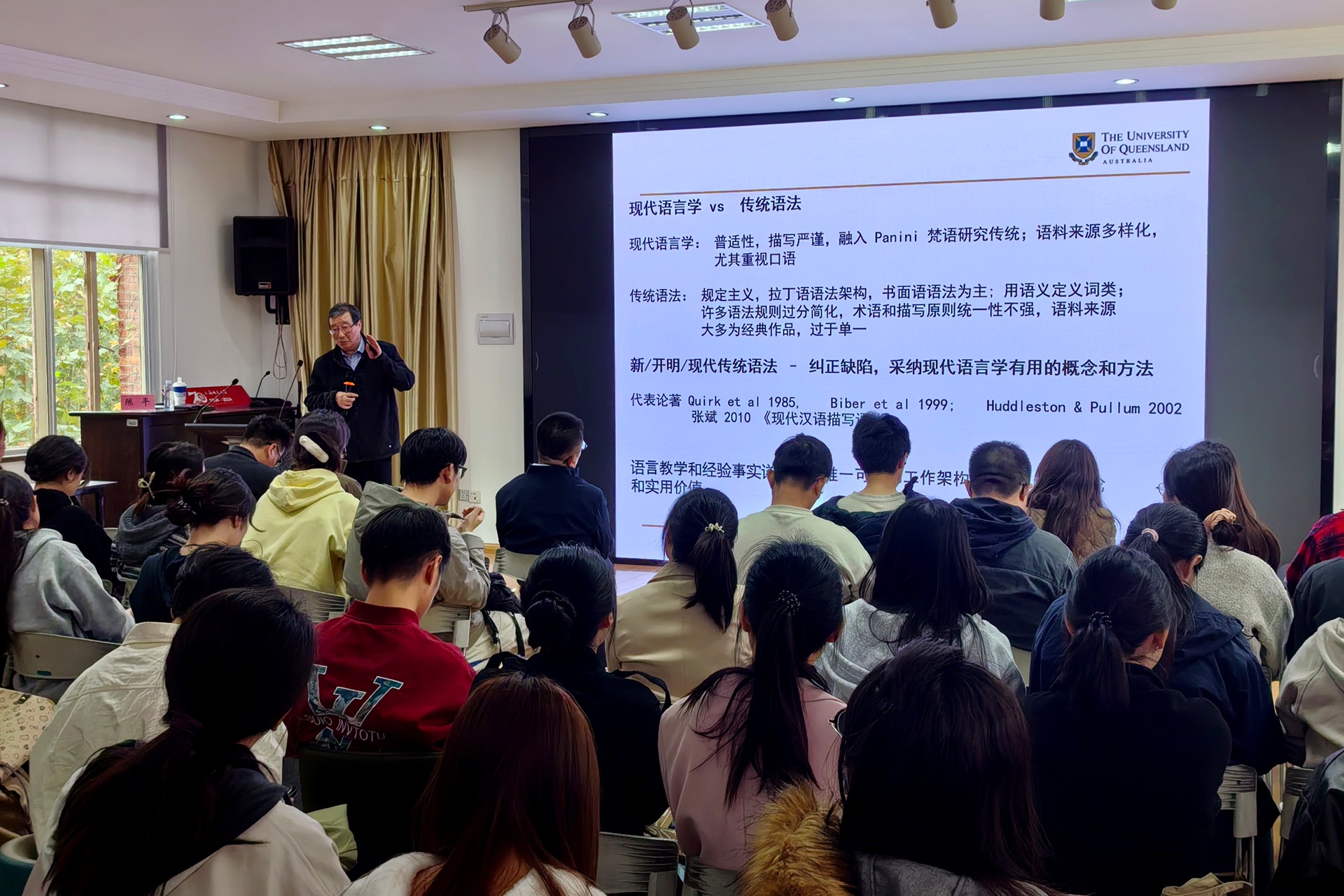 11月12日,澳大利亚昆士兰大学著名语言学家陈平教授应邀莅临我校对外汉语学院“观芷·国际中文大讲堂”,为全院师生带来了一场精彩的学术讲座,题为“从传统语法到大语言模型——论当代语言研究的理论基础”。本场讲座由对外汉语学院副院长朱庆祥教授主持,学院相关方向研究生和部分教师聆听该讲座。