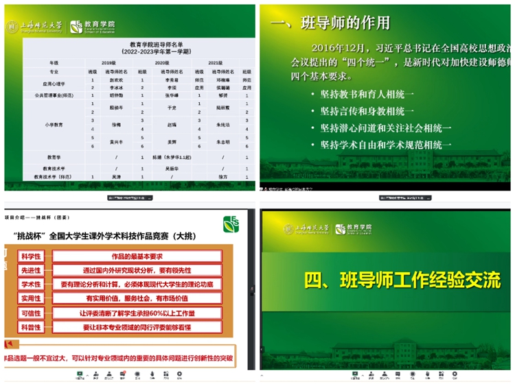 为贯彻落实立德树人根本任务和“三全育人”整体方针,服务学生成长成才,培养全面发展的可靠建设者和接班人,2022年12月14日上午九点,教育学院班导师工作会议在腾讯会议召开。党委书记徐晓明、院长夏惠贤、副院长石文典出席、党委副书记蔡丹、学院全体本科生班导师和辅导员参加。会议由党委副书记、副书记赵乐主持。