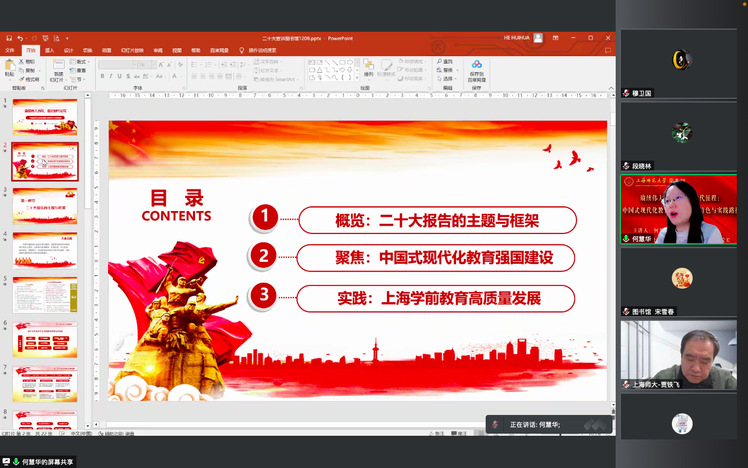 为深入学习贯彻党的二十大精神,根据中央、市委相关文件精神及学校党委统一部署,12月9日下午,校党的二十大精神专家理论宣讲团成员、学前教育学院副院长、博士生导师何慧华教授应邀为图书馆全体馆员作了题为“赓续伟大历程,奋进时代征程:中国式现代化教育强国的鲜明特色与实践路径”的专题宣讲报告。报告会以腾讯视频会议形式召开。图书馆馆长贾铁飞、党政班子成员、总支委员及全体馆员参加报告会。报告会由图书馆党总支委员、副馆长段晓林主持。