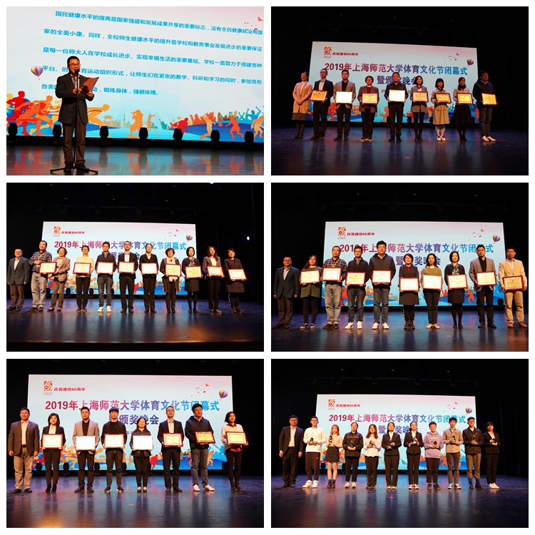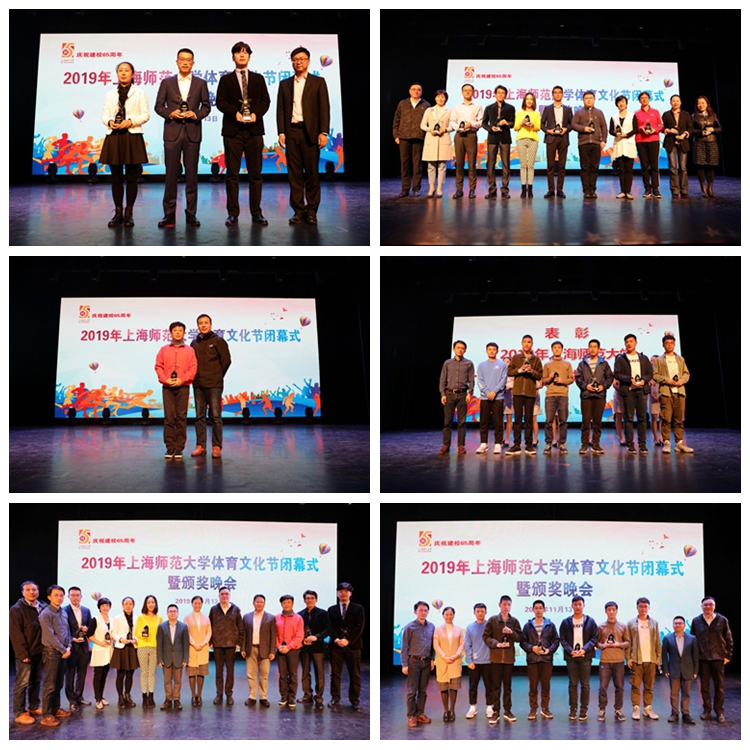 11月13日,2019年上海师范大学体育文化节闭幕式暨颁奖晚会在徐汇校区东部音乐厅举行,对我校在2018-2019年度及体育文化节期间表现突出的团体及个人进行表彰。校党委副书记、工会主席裴小倩,副校长、校体育运动委员会主任李晔以及校工会、学工部和体育学院相关负责人出席了闭幕式。