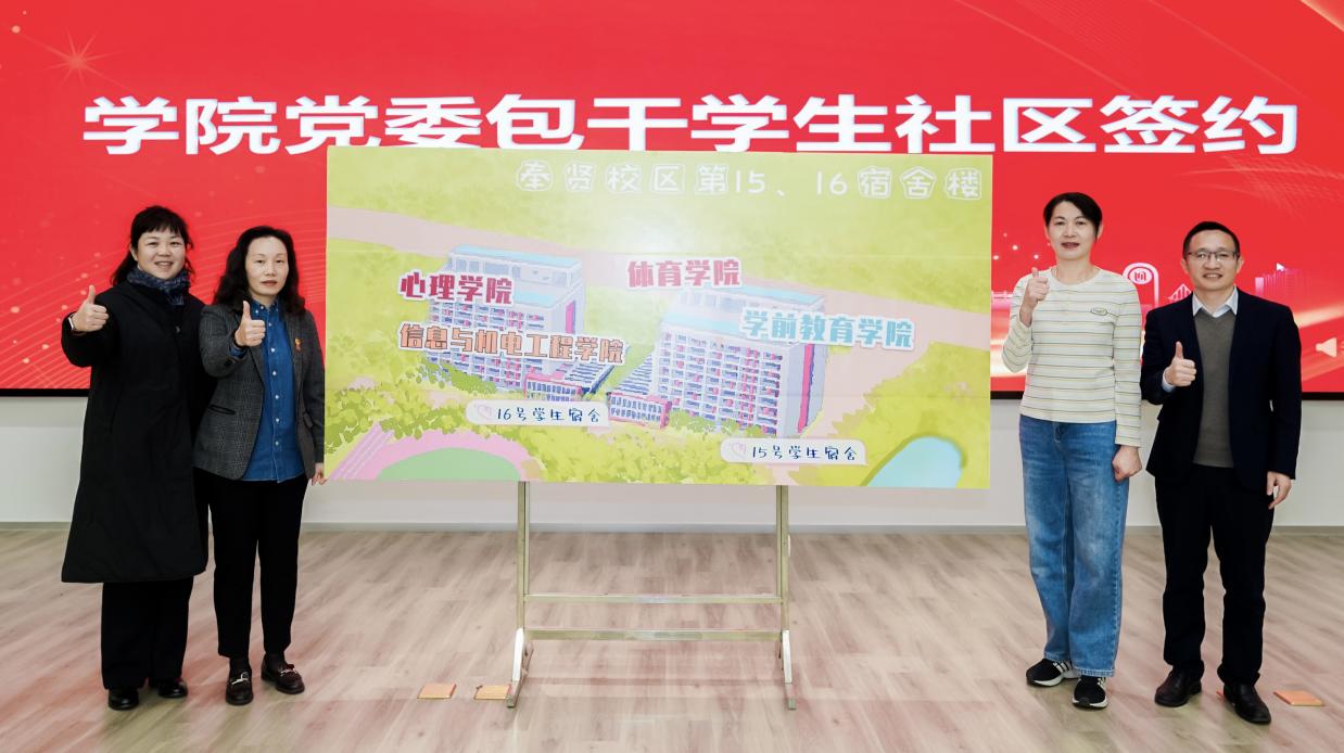 推进会上举行了学院党委包干学生社区签约仪式。学前教育学院党委书记杨成龙、心理学院党委书记张益、体育学院党委书记沈亚芳和信息与机电工程学院党委书记陈晓虹共同为学院党委包干学生社区入驻挂牌。