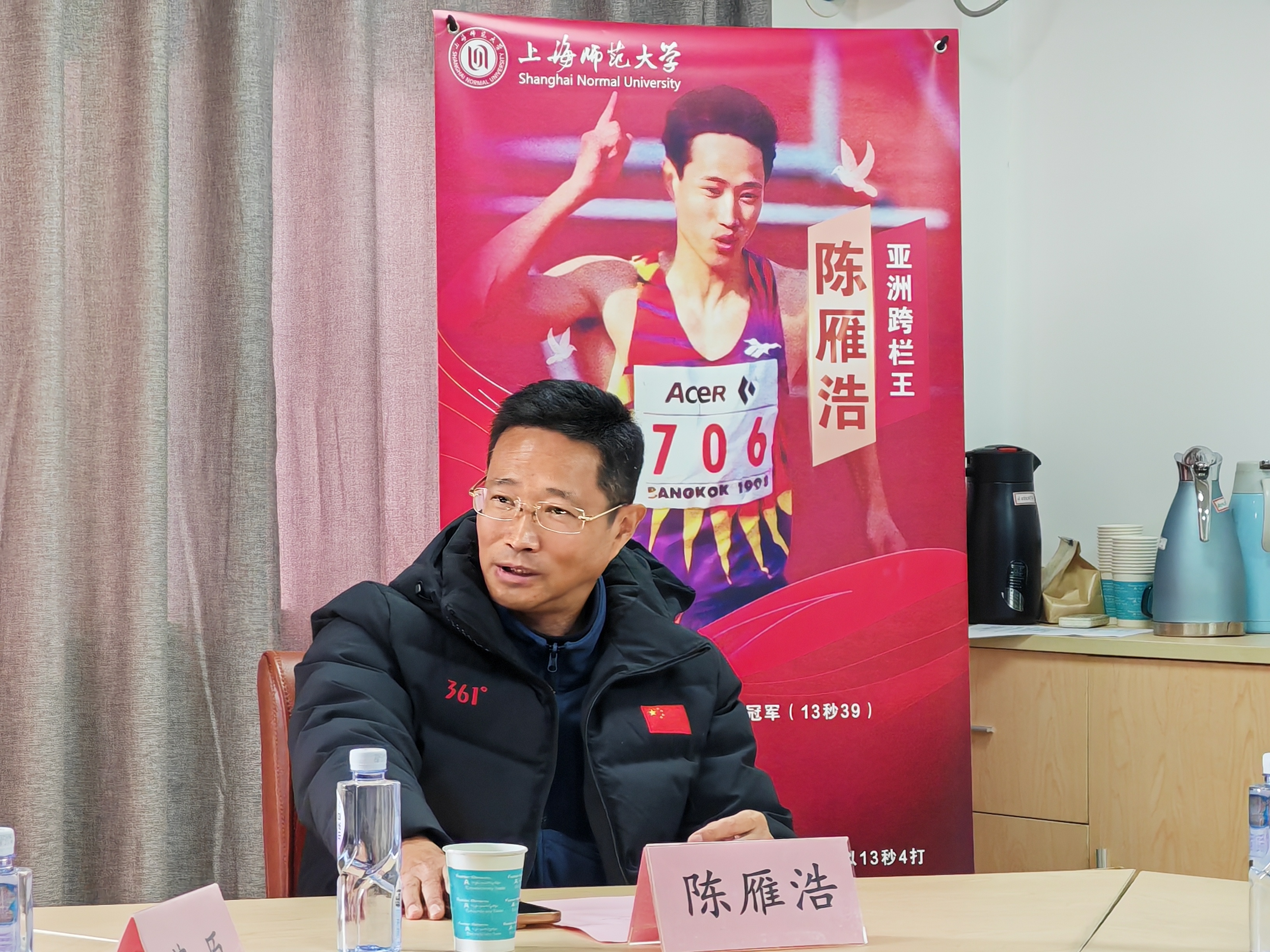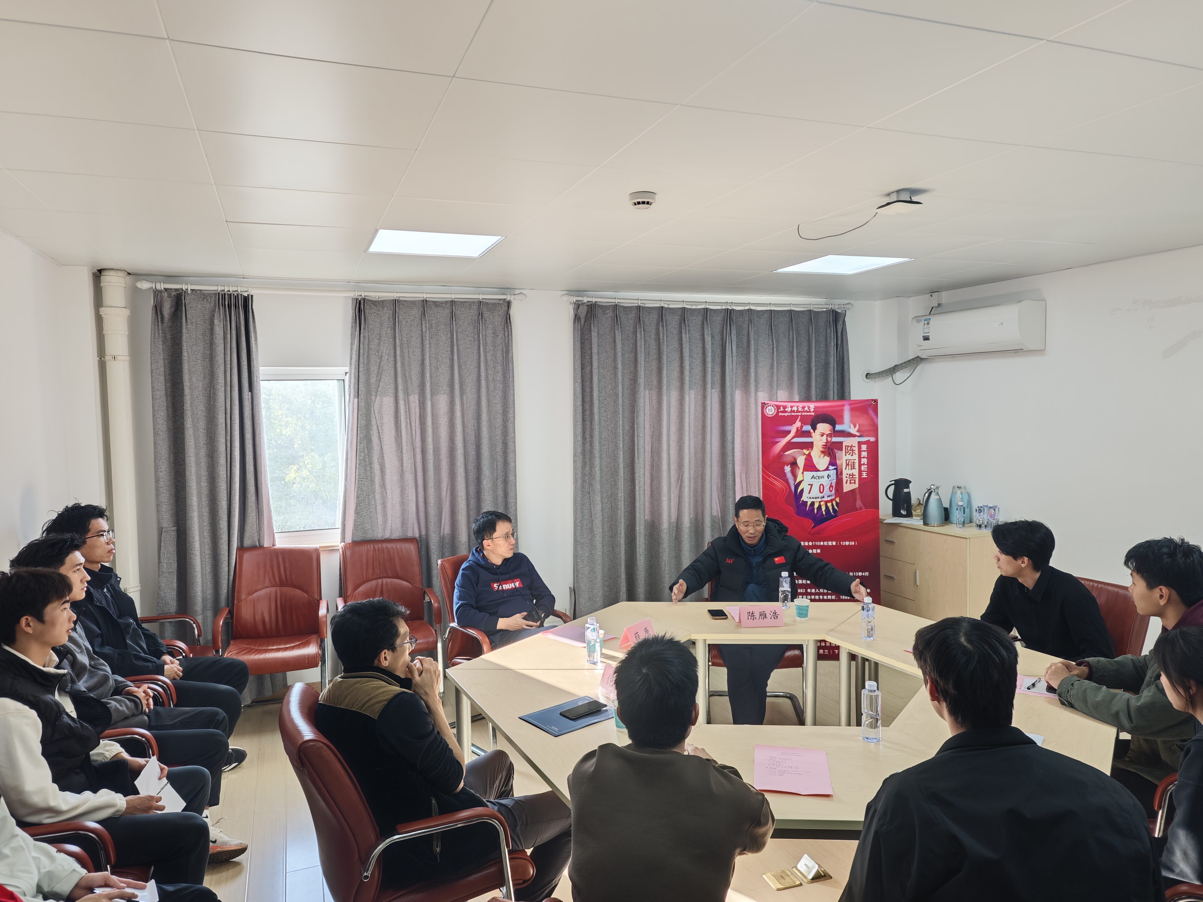 11月26日下午在新体育馆219,两届全运会跨栏冠军陈雁浩应我校体育学院邀请,出席了以“薪火相传、逐梦未来”为主题的座谈会,出席本次座谈会的有体育学院院长薛原、公共体育部副主任(主持工作)倪伟以及我校田径队全体学生。