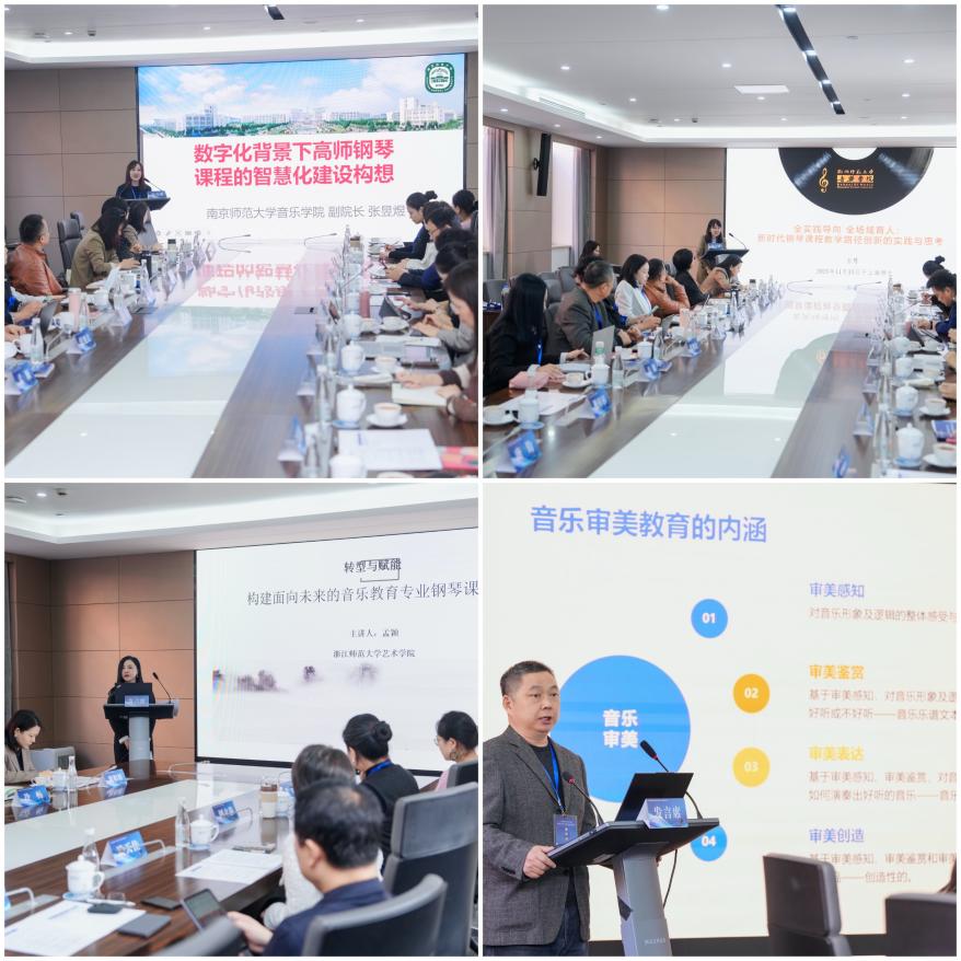 论坛上,付镜伊副教授代表南京师范大学音乐学院聚焦数字化背景,提出高师钢琴课程智慧化建设构想。她强调需要实现人才培养思维转向,从图谱体系、教学模式、智慧评价、数字教材四方面推进建设。杭州师范大学音乐学院钢琴系主任金慧教授向大家分享了“全实践导向,全领域育人”的经验,她介绍了所在音乐学院的课程设置与比赛实践活动,重点阐述“民生乡建艺术团”以坛头村为例的乡村实践成果,凸显音乐赋能乡村建设、助力共同富裕的重要价值。浙江师范大学音乐学院学科主任孟颖教授结合综合院校教学实际,探讨音乐教育专业钢琴课程的定位与属性。她提出构建“四位一体”未来课程新模式,通过内容模块化、教学混合化、体系矩阵化等路径,培养“学者型教师”。安徽师范大学音乐学院键盘系主任张旭良教授立足音乐审美教育,解读义务教育美育课程标准。他分析了普通高校音乐教育专业钢琴课程建设的“痛点”,并提出针对性建设构想。