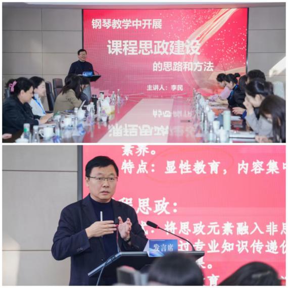 下午的论坛讲座及交流发言由我校音乐学院钢琴系主任谈天佳副教授主持。国内钢琴教育领域的权威专家李民教授围绕钢琴专业课程思政建设,解读相关政策文件等方面与各位高校教师进行了深入的交流。他区分了思政课程与课程思政的关系,提出以“思正”为底色,从挖掘保护、借鉴创新等维度培养传播中华优秀音乐文化的人才。