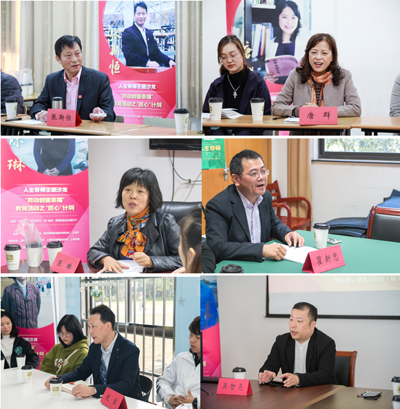 本期人生导师系列主题沙龙的六位主讲嘉宾分别为:现任上海市廊下中学校长、上海市五一劳动奖章、1980级中文系校友张斯恒,现任上海财经大学附属北郊高级中学校长、上海市五一劳动奖章、1982级数学系校友唐群,现任奉贤区实验中学校长、全国优秀教师、1982级化学系校友陈琳,现任上海市闵行区浦江第三中学班主任、上海市劳动模范、1987级中文系校友瞿新忠,现任上海广播电视台融媒体中心独立制作人、国家一级导演、1983级中文系校友史宏,现任上海星舍公益基金会理事长、1991级政法系校友吴智亮。六位校友通过与大学生讲述自己作为一名劳动者在各自岗位上的成长故事,充分发挥劳动模范作用和朋辈引领作用,让学生明白劳动对于自身成长的重要性。