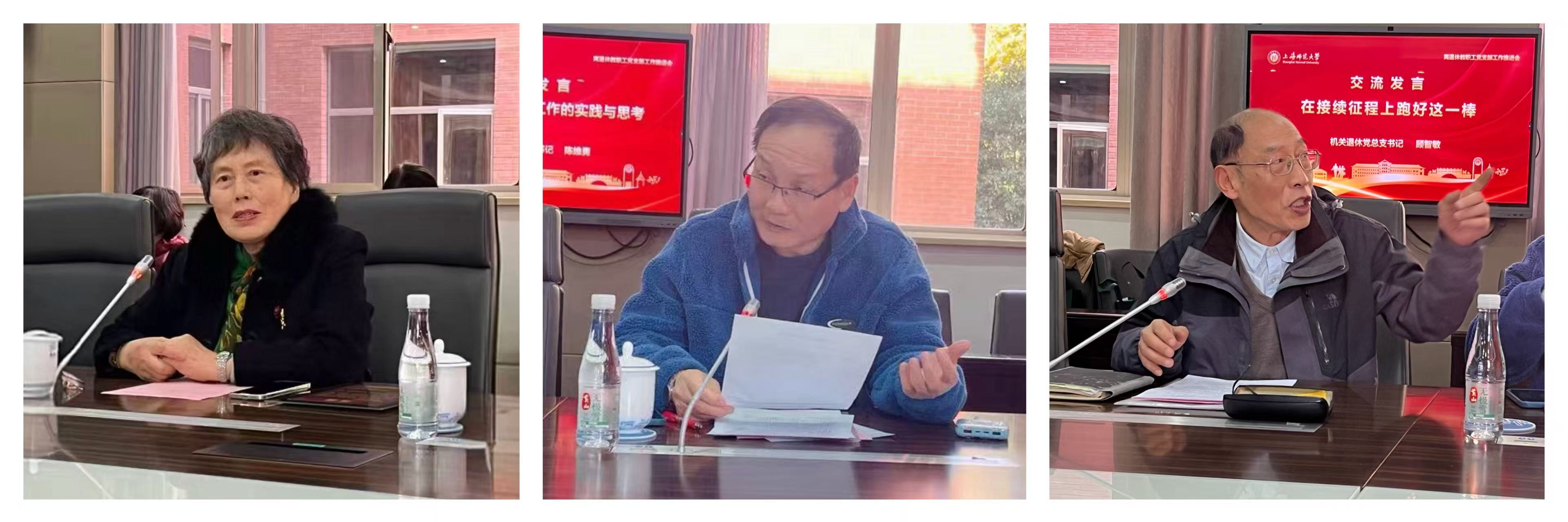 交流发言阶段,化材学院原退休教职工党支部书记薛思佳结合自身工作经历,分享了宝贵的工作经验,为新任党支部书记们开展工作提供了借鉴。旅专退休党总支书记陈维勇以《新时代离退休党建工作的实践与思考》为题,强调了提升退休党建工作实效的必要性,并从筑牢根基、激发活力、发挥优势、彰显特色四方面介绍了旅专离退休教职工党支部的实践与探索,并就接下来旅专退休教职工党建工作谈了设想。新任机关退休党总支书记顾智敏以《在接续征程上跑好这一棒》为题,分析了当前离退休教职工党建工作面临的问题和难点,并从教育、管理、服务三方面提出思路,表达了扛起工作责任、接续推进党支部建设的决心。