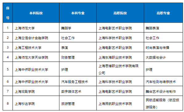 为进一步完善高本贯通培养模式工作,根据《上海“专科高等职业教育-应用型本科教育”人才贯通培养试点实施方案》(沪教委高〔2017〕39号),经学校申报、专家评议及市教委核定,同意2023年增设上海电影艺术职业学院与上海师范大学申报的舞蹈学等8个专科高等职业教育—应用本科教育贯通培养模式专业,相关教育教学及管理要求按有关规定执行。相关本科高校在招生中须安排专科高等学校毕业生招生计划。名单详见↓↓