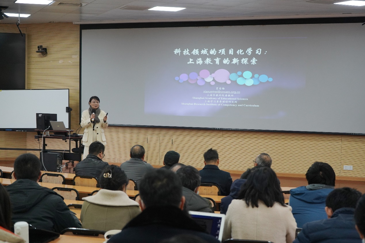 夏雪梅博士向教职工传达了市长龚正在上海市第十五届人民代表大会第六次会议的政府工作报告中关于教育、科技、人才工作的要求。她表示,高校教师处于科技发展的前沿阵地,科技的飞速发展对科技、创新融入基础教育提出了更高的要求,上海是一座创新之城,需要时刻保持危机意识,不仅要促进基础教育的均衡化发展,更要对标国际大都市做到高质量、优质化发展。报告从“基础教育中的科技项目化学习是怎样的”、“指向素养的项目化学习的关键设计要素”和“上海教育的新探索:为创新人才培育奠基”等三个方面具体介绍了当前上海基础教育在项目化学习方面的具体实践与探索,并通过实际教学案例分析,对国内外项目化学习的发展进行了比较,指出了本土项目化学习发展的不足和创新。同时,她也介绍了上海基础教育的发展现状与展望。她指出科技领域的项目化学习要引导学生“像科学家、工程师一样思考”,并引导学生经历科学家和工程师的实践或模拟实践。她希望师范大学教师在对接基础教育方面大有作为。