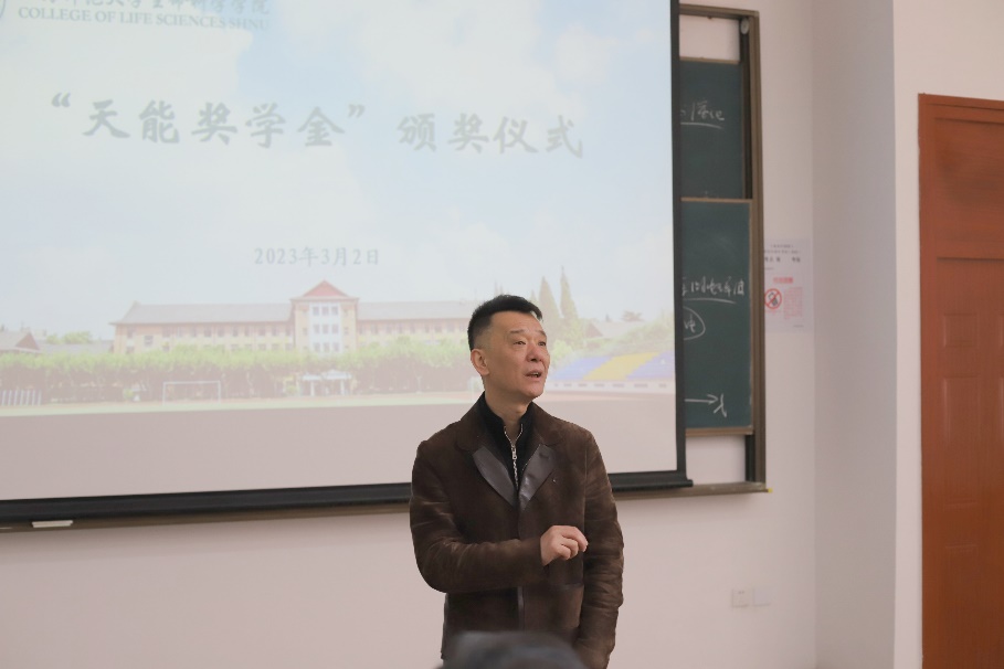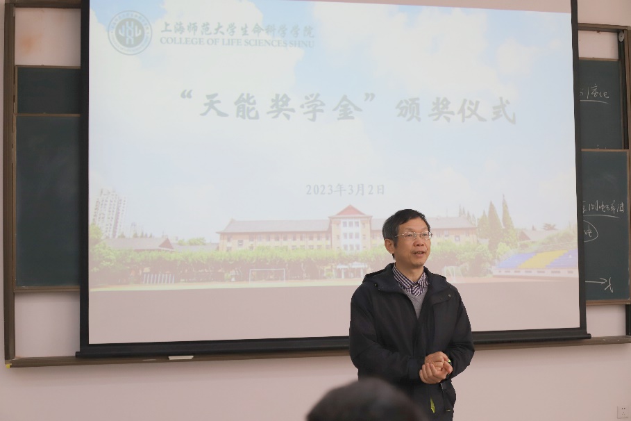 3月2日,生命科学学院第二届“天能奖学金”颁奖典礼在徐汇校区一教109教室举行。生命科学学院党委书记康文宣读表彰决定,上海天能生命科学有限公司董事长孟诚卫、生命科学学院院长杨仲南为荣获第二届“天能奖学金”获奖的33名学生(团队)和4个班集体颁奖。生命科学学院黄继荣教授主持颁奖仪式。