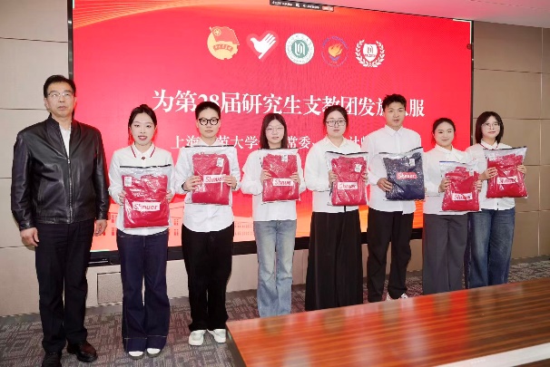 曹光明为第28届研究生支教团发放队服。学校的关心和支持是研支团不断前行的强大动力。