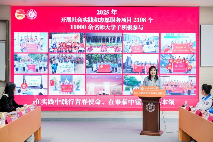 1月21日下午,上海师范大学2026年寒假社会实践出征仪式在徐汇校区举行。校党委副书记、副校长朱惠军,组织部、宣传部、学工部、研工部、团委、教务处等职能部门负责人,以及各学院学生工作副书记、负责人、团委书记、教师及学生代表参加本次活动。