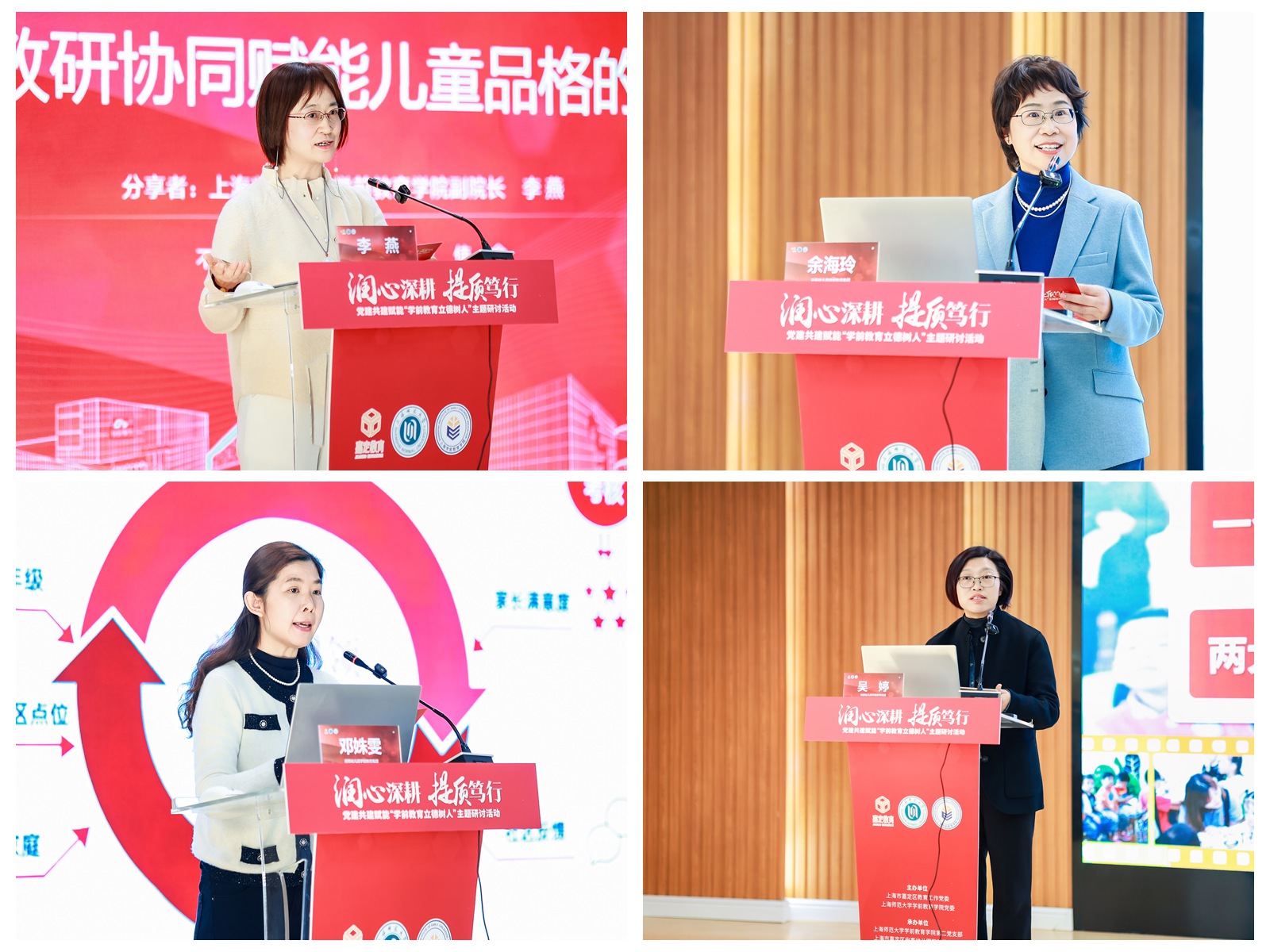 李燕以《产教研协同赋能儿童品格的养成》为题做经验交流,从师资培训、课程实施、深入研究等方面分享协同育人机制和实施路径。嘉定区安亭幼儿园学前教育集团理事长余海玲、嘉定区南翔幼儿园学前教育集团理事长邓姝雯、嘉定区桃园幼儿园学前教育集团理事长吴婷聚焦提升教师育德能力和深化儿童品德启蒙,介绍各自园所党建引领学前立德树人的园本化实践。