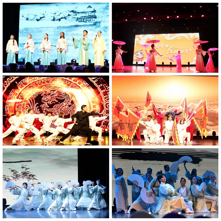 钟灵毓秀汉语梦,溢彩华年异乡情。相声节目《手机》拉开了晚会第二篇章的序幕,中外学生合作用诙谐幽默的相声语言提出适度使用手机的呼吁,引发全场观众的共鸣。中华传统曲艺文化快板的加入,更是引得现场观众的阵阵笑声和掌声。歌曲串烧《追梦异乡人》表达了年轻人对时光的感悟,对友谊的期盼,以及敢于挑战未来,为梦想而拼搏的斗志。由喀麦隆留学生何浩德主唱的歌伴舞《多情的土地》,饱满而深情的歌声唱出了留学生们内心最真实的情感,他们不远万里来中国求学,感受到中国文化的开放包容,和中国朋友的热情善良。