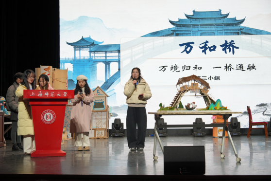 2月8日,项目化实践成果展示会在上海师范大学音乐厅举行,展示活动由建筑工程学院副院长朱美春主持,邀请了上海市奉贤区教育学院副院长翁海亮、上海市嘉定区教育学院科学教研员陈健、顶思教育集团创始人马晓平、上海宏文学校学生发展部总监李子昕、上海师范大学第四附属中学校长朱银辉、上海师范大学附属崇明正大中学校长王通、上海师范大学建筑工程学院科学教育系党支部书记彭丽担任评委。十六个学习小组依次登场,就“贯木拱桥”“智能喵屋”“未来城市”“风力发电塔”四个项目进行最终成果汇报与答辩。从严谨的设计图纸到精巧的实体模型,从生动的解说视频到清晰的逻辑阐述,全面展现学员在一周内将理论转化为实践、让创意落地的学习成效,体现了突出的工程思维、跨学科整合能力与团队协作精神。评委专家对各组作品逐一打分,上海市嘉定区教育学院科学教研员陈健进行了专业点评。