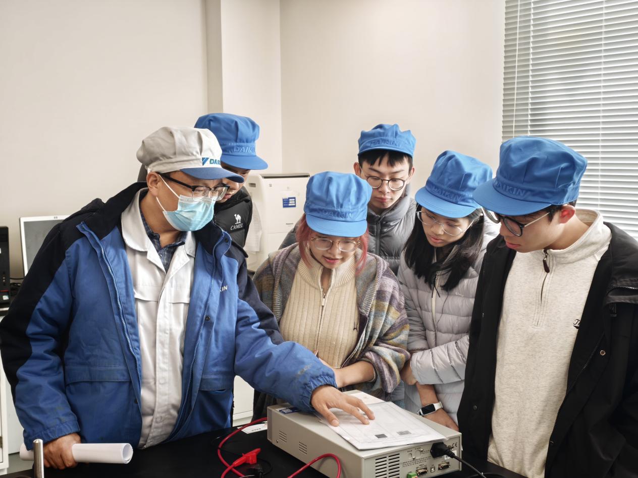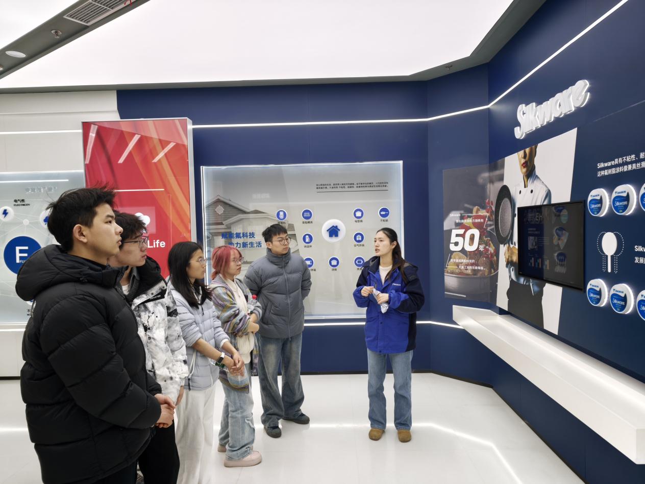 在企业展厅,丰富的展品和多媒体展示呈现了大金材料在各个领域的广泛应用。学生们驻足观看,围绕产业发展趋势、岗位要求、职业发展路径等与负责人深入交流。负责人结合公司实际,鼓励同学们夯实专业基础,主动对接产业前沿。