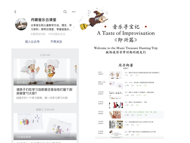 “丹卿音乐云课堂”于2020年1月 28 日开通。至今共推送了八堂音乐课程。第一篇分享了她在2017年为上海音乐厅暑期艺术夏令营编写的《音乐寻宝记-即兴篇》音乐课教程资料,向小朋友们免费开放了在家学音乐的专业课程。第二篇《春节音乐寻宝记窝里探索Rhythm节奏》向宅娃们介绍了宅在家里没乐器,如何发现身边的乐器,探索身边的音乐。第三篇《在家挖掘内在学习动力+养成学习好习惯》告诉家长如何帮助宅娃激发学习兴趣,提高学习动力,引导他们制定学习计划、掌握学习方法,让学习更有成就感。接下来的三篇由号友们的提问生发而来,是针对琴童初学琴时常碰到的问题的系列课程,通过简单有趣的案例帮助琴童们掌握打好学琴的基础。第七篇《音乐渡人-家庭原创音乐故事征集》想通过音乐来渡国人于战“疫”,给孩子们一个美好而不枯燥的假期。第八篇《请孩子们吃学习自助餐还是给他们留个厨房做掌勺大厨》是关于全民线上学习热潮的一些感想,在其中,周老师和大家探讨了小宅娃们学习的自选、自主、自控的可能性。