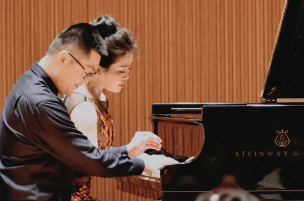 曲终观众仍意犹未尽,蔡颖与龚天鹏两人一时兴起,又为大家加演了由他们改编的四手联弹版《拉赫玛尼诺夫第二钢琴协奏曲》第二乐章的片段。当两人奏至乐段高潮部分,龚天鹏更是为观众一展歌喉。四手联弹加男声演唱的特别形式,让观众连连喝彩,音乐会在热烈愉快的气氛中落下帷幕。