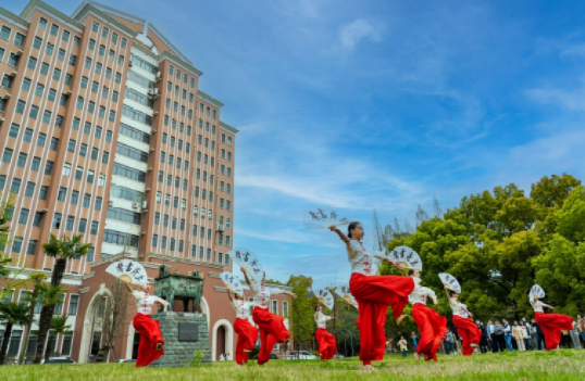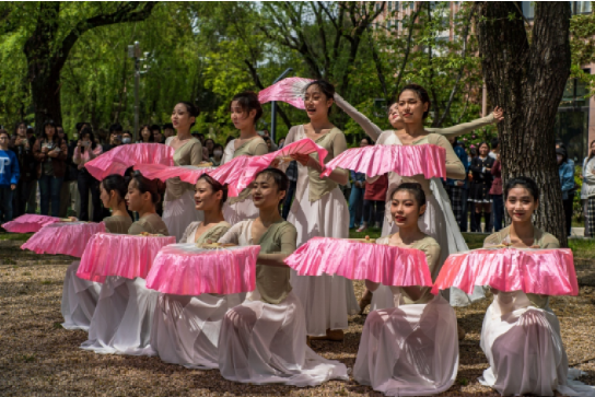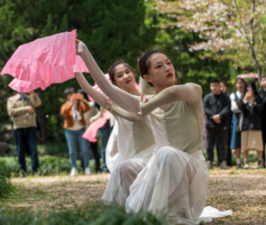 在三人舞《桂雨》中,舞者优美婉约的舞姿尽显娴静之味、淑然之气,与学思湖畔春意绵绵的垂柳、朵朵烂漫的粉樱相映成趣。群舞《桂雨鹭影映清荷》的舞者舞姿飘逸而娇俏,似乎面朝深邃的学思湖在喃喃低语。