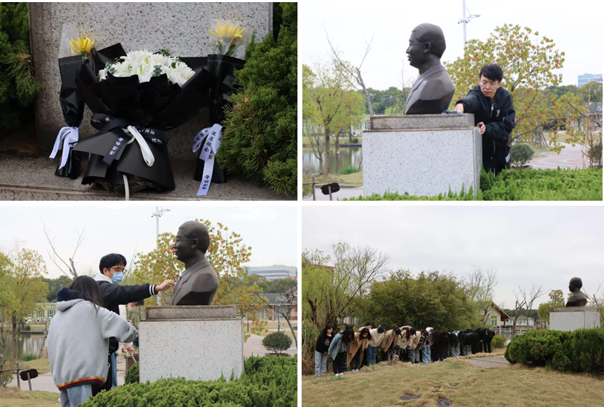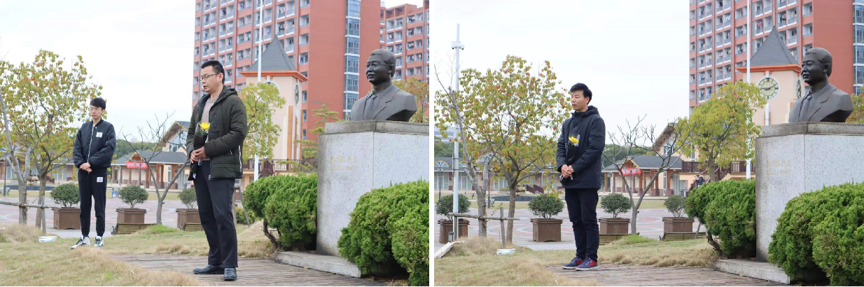 教师代表、辅导员、宝根师德师风研习社成员和学生代表分别为贺宝根烈士铜像敬献鲜花,为铜像进行擦拭、清扫。随后,全体师生庄严肃立、默哀致敬,向贺宝根烈士铜像行三鞠躬礼,表达对英烈的无限哀思和崇高敬意。
