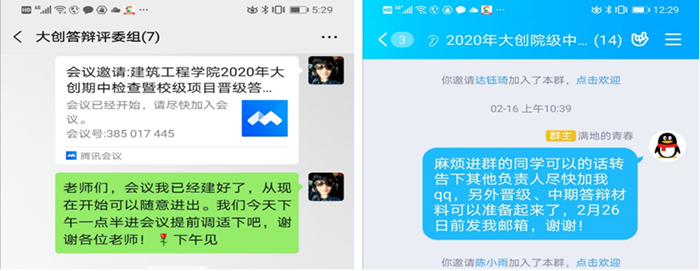 学院共有13个项目、53位同学参与了2020年度的大创项目训练计划。为确保云答辩顺利进行,学院大创管理员王方方老师从2月中旬便开始筹备计划,组建了“大创答辩评委组”微信群、“2020年大创中期检查校级晋级答辩” QQ群,配合教学院长完成答辩评委遴选、项目负责人答辩通知、答辩平台测试、答辩表格制定、答辩流程梳理等工作。师生们答辩前期对答辩平台进行了多次的测试、演练。