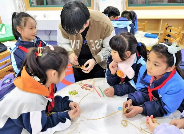 把非遗项目引入课后服务的还有上海师范大学附属奉贤实验小学,该校开设的“匠心竹编·快乐60分”课程十分受小朋友们的喜爱,小朋友们迫不及待地走进课堂,拿起竹条跃跃欲试,碰到不理解的问题时纷纷举手询问。