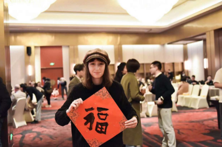 来自法国的乐盖曦(乐乐),2015年留学来到上海,从此与这座城市结下不解之缘。今天是她第一次参加在沪外籍人士迎新联谊,同时体验多项中国非遗技艺。在书法大师的指导下,乐乐提笔、蘸墨写起了喜庆的春联和“福”字,与书法大师交流汉字文化。乐乐说,她觉得中文特别有魅力的地方,在于每个汉字、偏旁、部首都有自己的意思,她希望将中国和海派文化传播给更多人知晓。现场其乐融融的场景不禁让人感叹中国文化的智慧,更感动于各国文化之间的交流碰撞。