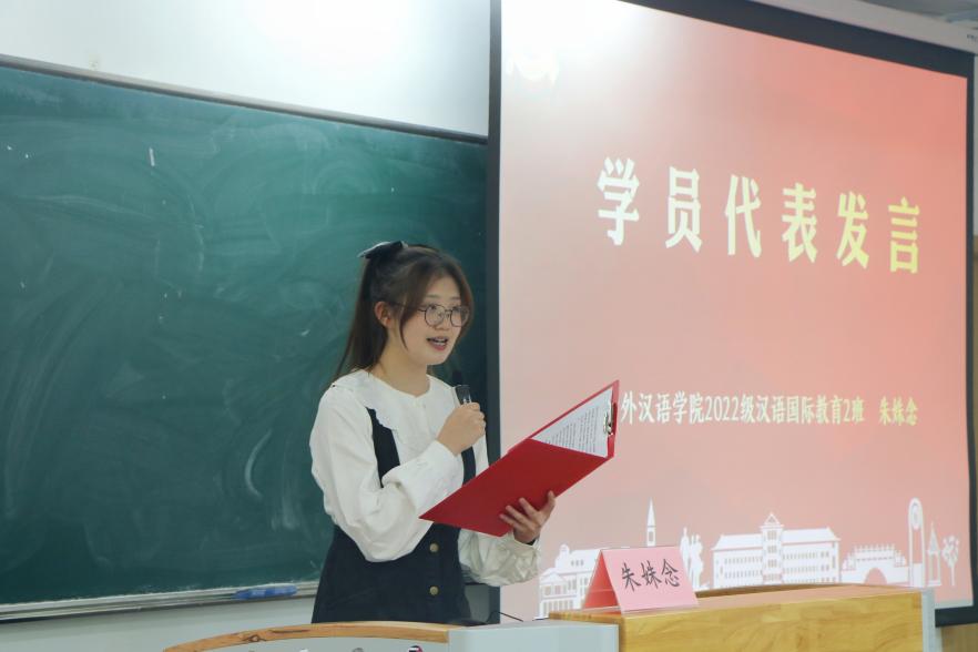 在全体师生齐唱的国歌声中,开班典礼正式开始。对外汉语学院2022级汉语国际教育2班朱姝念作为学生代表进行发言,分享个人积极向党组织靠拢的经历。她向同学们提出倡议:作为光荣的青年入党积极分子,我们要以理想信念筑牢信仰之基,知行合一,敢为人先,甘于奉献,以青春之我创建青春之国家,为实现中华民族伟大复兴贡献先锋力量。