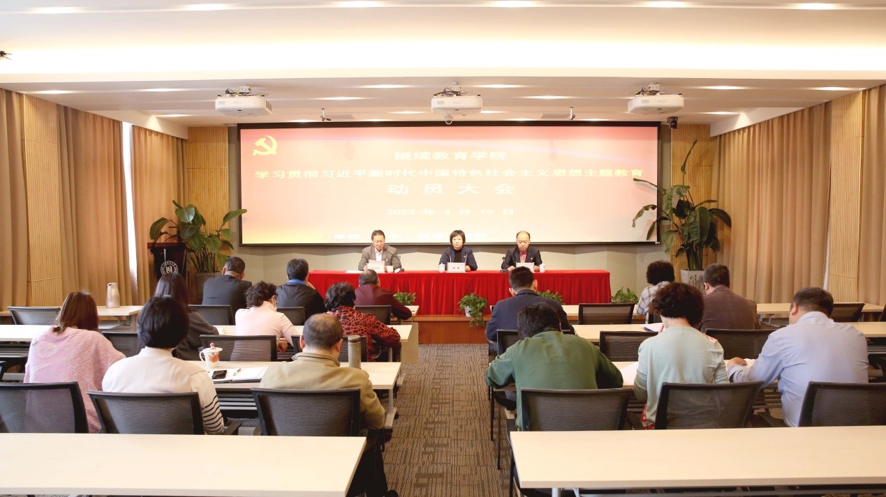 4月19日上午,继续教育学院在学院1号楼201室召开学习贯彻习近平新时代中国特色社会主义思想主题教育动员会,学院党总支委员、各党支部书记、全体在职党员和退休党支部代表参加会议。校党委常委、统战部部长、学校主题教育第一指导组组长周理到会作指导讲话,继续教育学院党总支书记金国忠作动员讲话。会议由继续教育学院院长俞伟东主持。