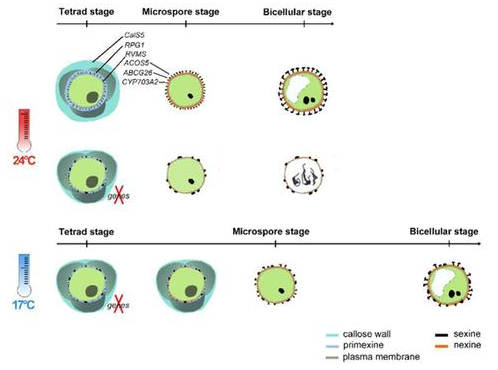 杨仲南团队长期从事植物雄性不育机理的研究。在偶然条件下,课题组发现一个拟南芥不育系在低温下能够恢复育性,将其命名为reversible male sterile (rvms-1)。该基因编码一个在小孢子母细胞中特异表达的具有GDSL结构域的脂酶,其在小孢子发育为成熟的花粉粒过程中提供质膜原料。