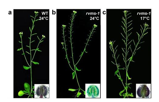 团队成员、副教授朱骏介绍,低温延缓植物生长发育是普遍的现象。因此,团队推测低温下发育速度的减缓有助于rvms小孢子积累足够的原料,发育成为有功能的花粉粒。为了证明这一点,团队利用化学诱变筛选到了rvms突变体的恢复子res1,是细胞周期蛋白依赖激酶CDKA;1的一个弱突变体。该突变体的减数分裂过程显著延长,从而有效保护小孢子发育进程。此外,rvms-1与一个生长缓慢的突变体chlm-4杂交后,其双突变体也能部分恢复育性。这些结果都表明,低温导致的缓慢生长是rvms育性恢复的机制。