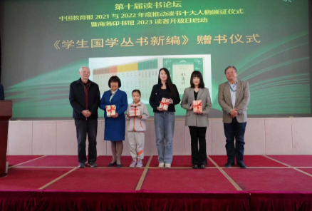商务印书馆党委书记、执行董事顾青表示,商务印书馆始终与中国教育同行,深耕青少年阅读,从2014年开始,商务印书馆与中国教育报等联合主办读书论坛暨推动读书十大人物颁证仪式,今年已是第10年。10年来,商务印书馆与中国教育报推动读书十大人物一起,服务教育,推动阅读,引领阅读。同时,联合举办“为中国未来而读”阅读行动研讨会,足迹遍布安徽、青海、河南、陕西、四川、吉林、宁夏、贵州等中西部地区。此外,还面向广大师生开展了“放飞梦想的翅膀”系列公益活动,设立《新华字典》奖学金,建立了乡村阅读中心,成立了“商务印书馆全民阅读促进中心”,为推动全民阅读特别是青少年阅读做出了独特的贡献。2023年开始,通过邀请北京师范大学王宁教授、北京四中顾德希老师等举办“涵芬楼国学系列讲座”等形式,引导青少年爱读书、读好书、善读书。