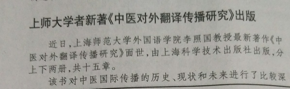 社会科学报:上海师大学者新著《中医对外翻译传播研究》出版