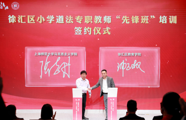 在推进会现场,上海师范大学马克思主义学院院长张志丹和徐汇教育学院院长浦正权签订了徐汇区小学道德与法治专职教师“先锋班”培训协议书,由上海师大马克思主义学院为徐汇区小学在职道德与法治专职教师提供专业化培养,提升区域小学思政课教师队伍的专业化水平。