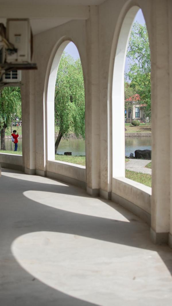 四教长廊,可以毫无保留地容纳习习微风与阳光,午后的绿树与光影永远看不厌。
