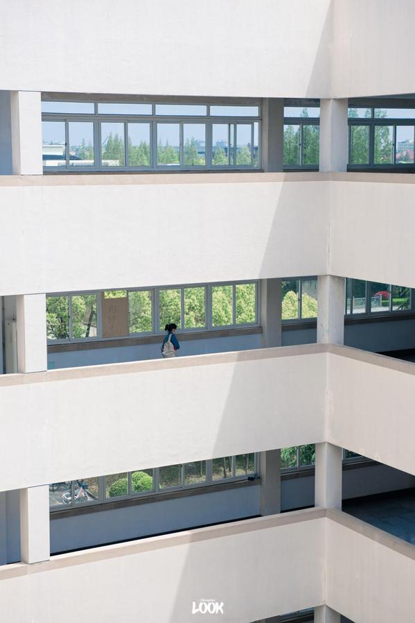外表素净的三教,像身着白衬衫的少年,习惯沉默不语,但总将绿意悄悄传递。阳光会重新构造三教内的光影线条,有窗外绿树的陪伴,多走一圈长廊也不是问题。