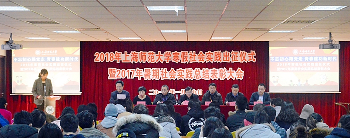 1月19日,2018年上海师范大学寒假社会实践出征仪式暨2017年暑期社会实践总结表彰大会在徐汇校区香樟苑多功能厅举行。校党委副书记、副校长葛卫华,组织部、宣传部、学工部、研工部、教务处、团委等职能部处负责人及各学院学生工作副书记出席本次会议。葛卫华为寒假社会实践团队授旗,标志着我校2018年寒假社会实践全面启动。