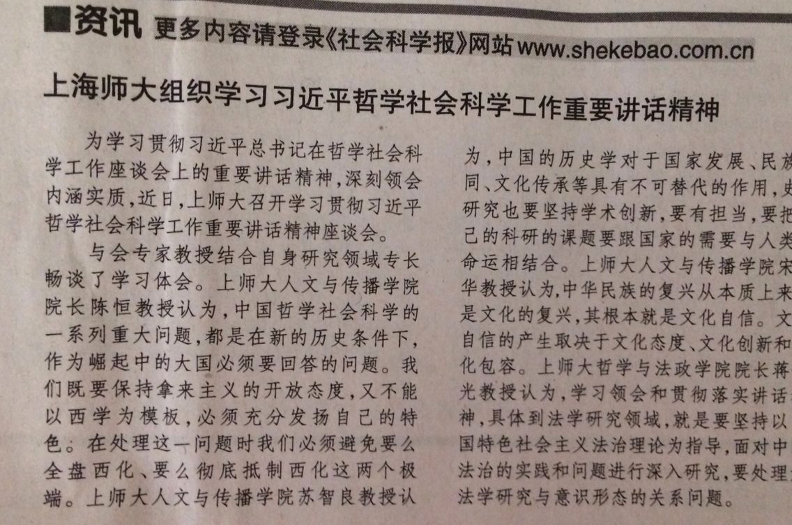 社会科学报:上海师大组织学习习近平哲学社会科学工作重要讲话精神
