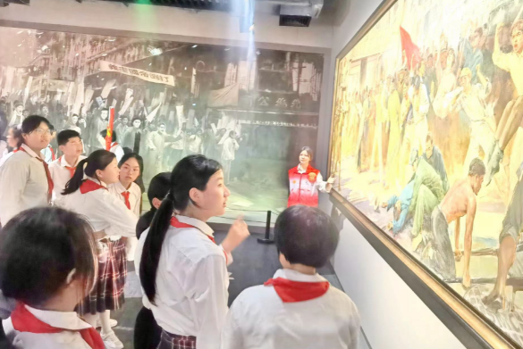在第二展厅,油画《南京路上的五卅惨案》是本次红色工运艺术课重点讲述的艺术作品,这幅由中国油画届大师、中国美术学院著名教授全山石创作的大幅现实主义题材的油画作品,展现的1925年5月30日当天下午,南京路上游行示威的工人和学生与英租界巡捕之间激烈对抗的情景。虽然画面中的人物并未指向哪个历史人物,但在五卅运动中前仆后继的革命志士的群像却呼之欲出。