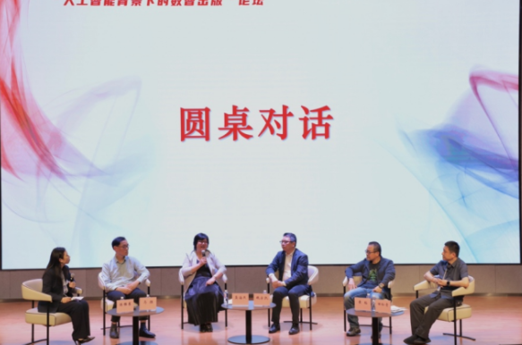 由上海师范大学影视传媒学院出版传媒系主任陈雅赛主持的圆桌对话环节中,上海译文出版社总编辑马胜、上海书画出版社总编辑田松青、华东师范大学出版社总编辑龚海燕、上海三联书店总编辑黄韬和百度(中国)有限公司AI技术生态华东区负责人魏宗凯,就AI技术如何帮助实现内容的个性化定制、如何助力精准营销、加强版权保护等行业痛点、难点等展开交流,