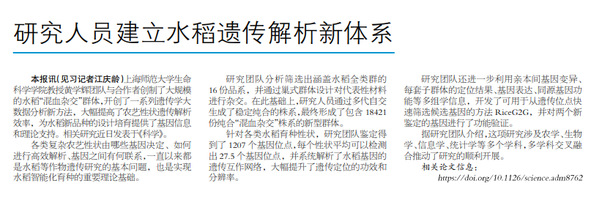 研究团队还进一步利用亲本间基因变异、 每套子群体的定位结果、基因表达、同源基因功 能等多组学信息,开发了可用于从遗传位点快 速筛选候选基因的方法 RiceG2G,并对两个新 鉴定的基因进行了功能验证。 据研究团队介绍,这项研究涉及农学、生物 学、信息学、统计学等多个学科,多学科交叉融 合推动了研究的顺利开展。