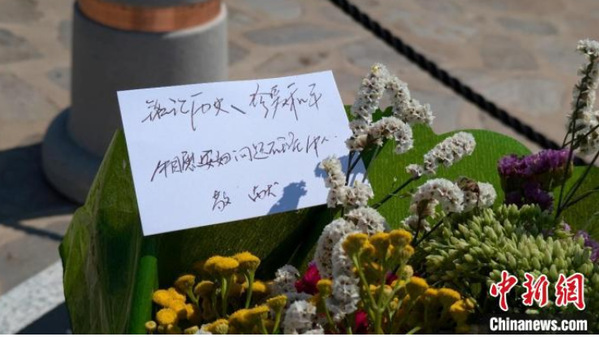 2024年8月9日,中国“慰安妇”问题研究中心代表蒋杰老师于意大利萨丁岛斯廷蒂诺市向少女像敬献花束。 上海师范大学中国“慰安妇”问题研究中心供图